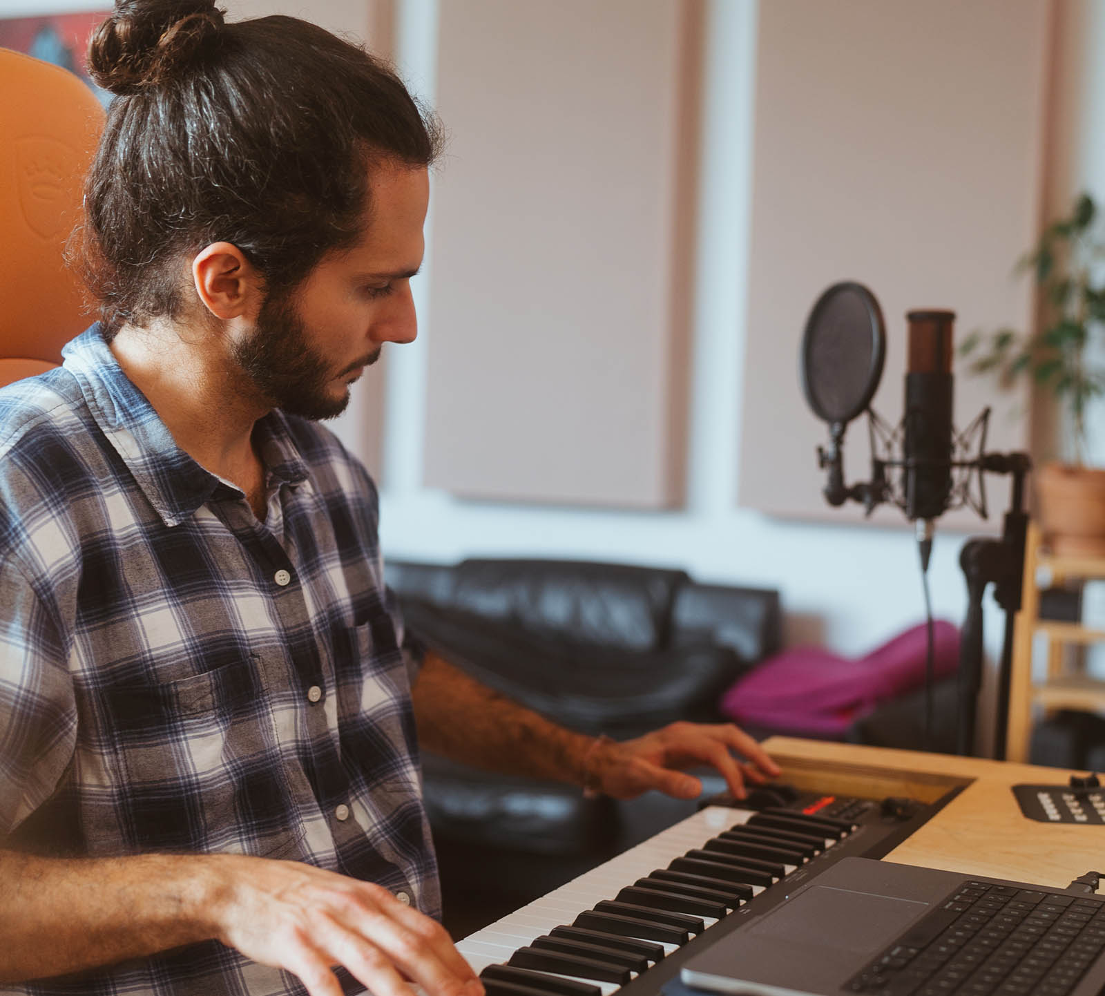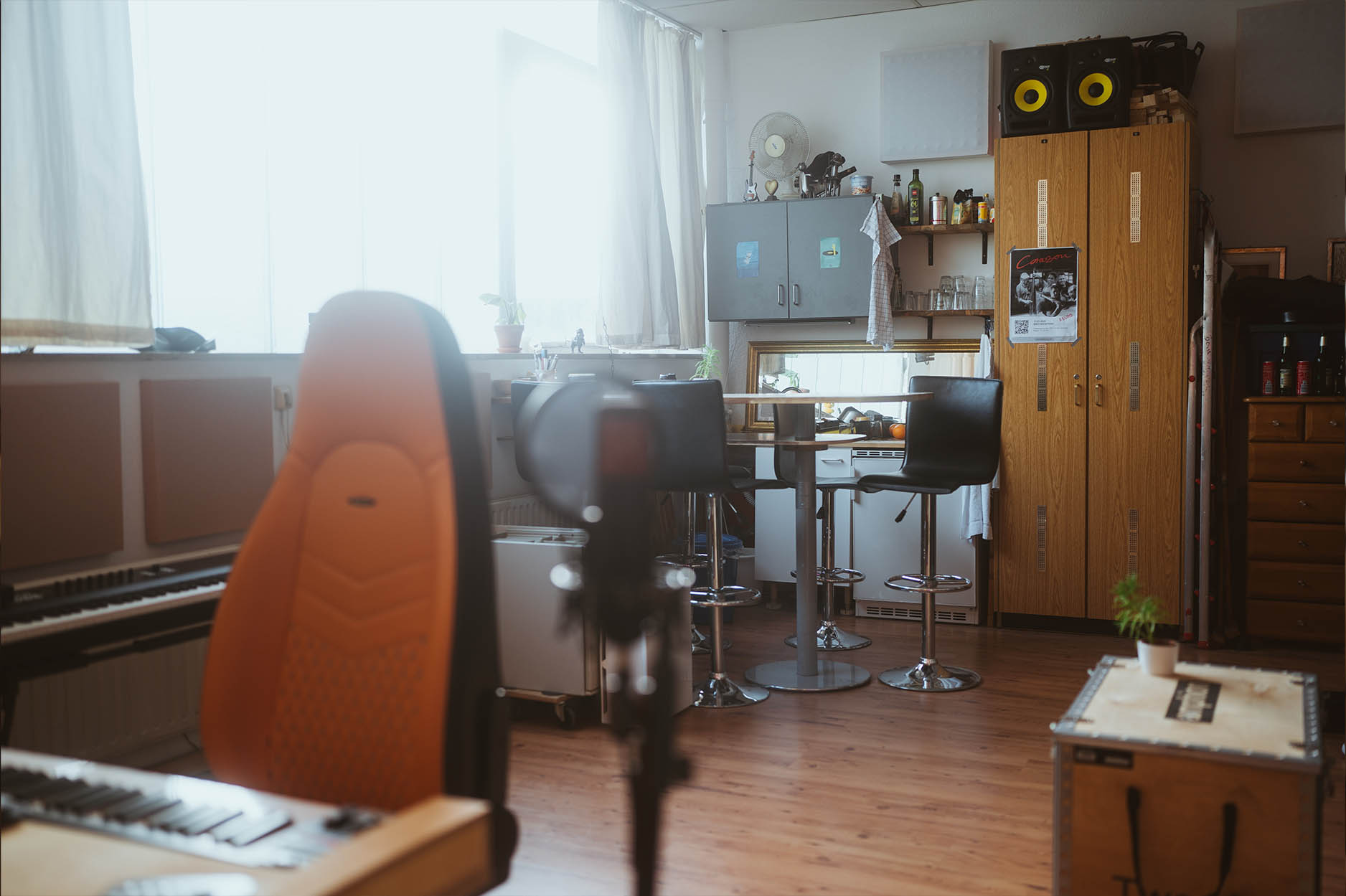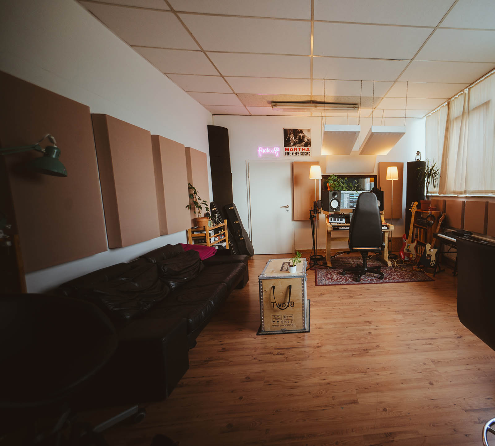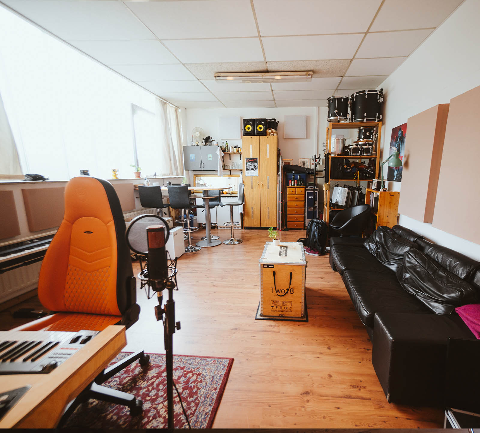 There are also multiple keyboards, guitars, basses, amps, a drumset and all sorts of percussions available to find the perfect sound.